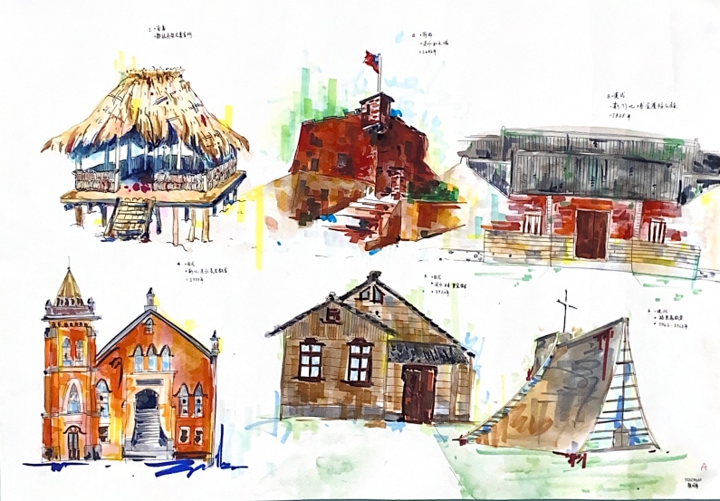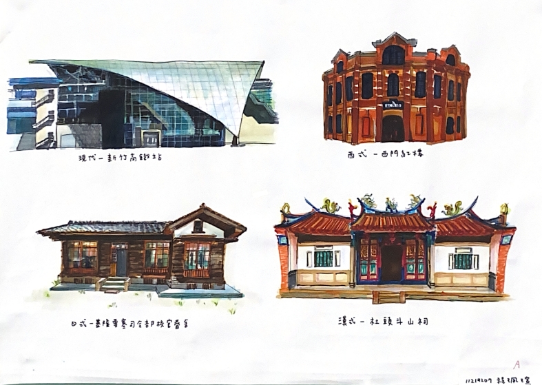介紹西洋、中國、台灣建築,包含建築發展歷史、建築形式、建築特色等。學期末讓同學結合上課所學,挑選四~六個不同時期之建築進行正立面繪製。