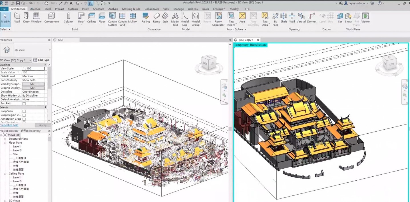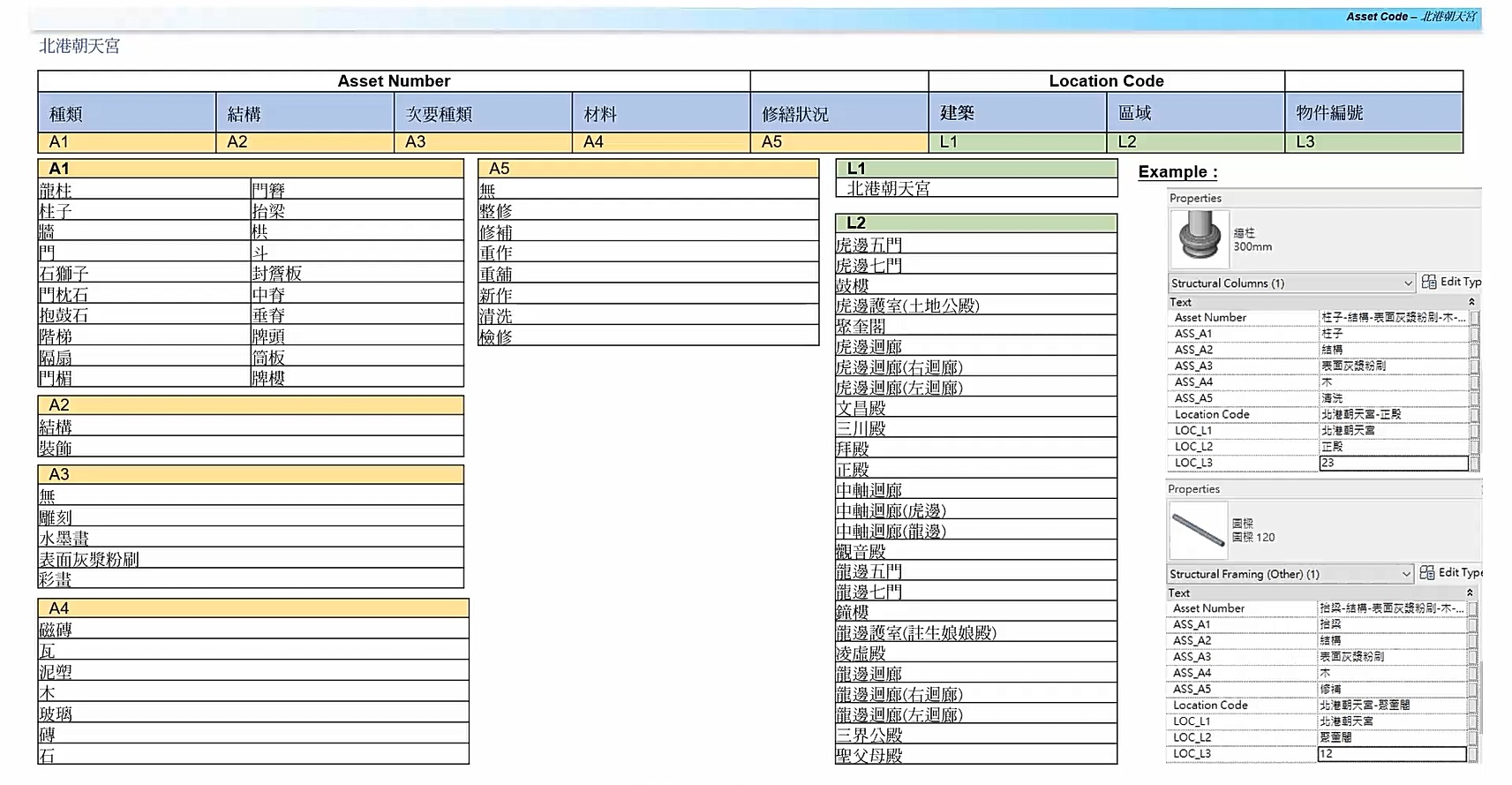 本計畫將有效應用國定古蹟3D 模型,與微型氣象站之監測資料,提供「可視化風險管理系統」與資料圖台進行嫁接呈現。根據目前文資局已在執行之「文化資產微型氣象站建置及維運計畫」,並經確認獲得具代表性的預防性保存監測數據,結合至「國定古蹟3D 模型建置計畫」的點雲模型當中。在經過戶外環境流場模擬、室內微氣候趨勢計算比對之結果,即時產生瞬時影像,將超過材料劣損臨界值的位置,回饋到點雲座標上,於該點(區)呈現出特別的警告符號,供現場管理維護人員能快速前往處理相關劣損因子,同時提供文資局監管於異地進行修復指導或給予監修,達到「在地修護、遠端支援」目標。依據目前文資局已執行的相關計畫(國定古蹟3D 模型與微型氣象站之監測資料),將原始3D點雲資料(雲林北港朝天宮等古蹟案例)進行處理與轉換成建築使用的圖形資料與資訊模型(H-BIM),並建立「古蹟部位分類」(BIM-Catalog)與參考「國際通用OmniClass codes」進行「來源編碼」(Source Code)以方便未來各類編碼資料之轉換。
