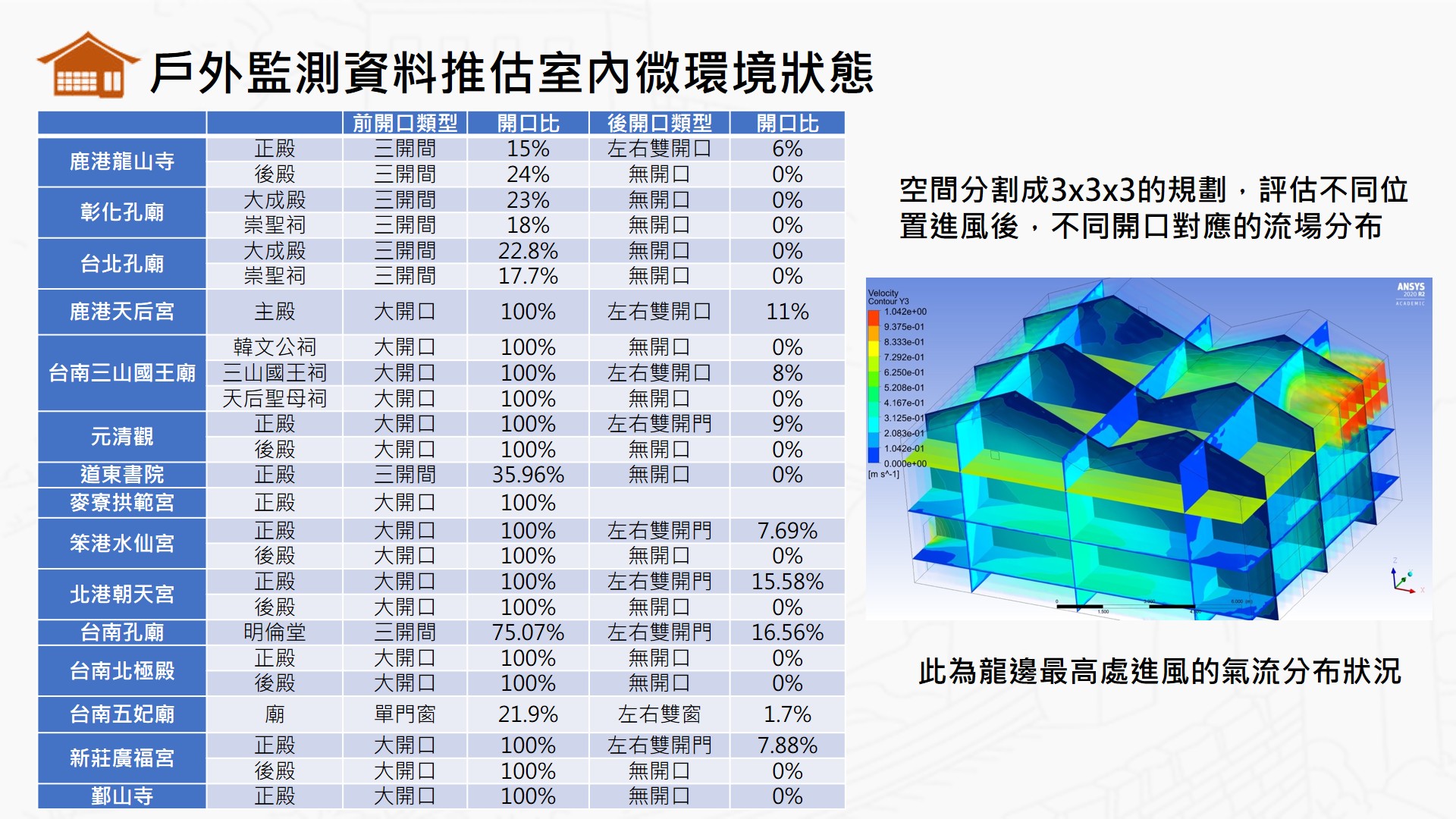 研究計畫成果已透過上述實場案例「現場點雲掃描」(Point cloud scan)與「轉換至HBIM」(使用Autodesk Revit軟體)分類、資料標籤化與編碼後,在進一步「建立3D資訊模型」,並且進行相關「渲染擬真」(Rendering) 供專業人士、古蹟保管者與一般民眾使用,計畫再進階成果部分,將上述完成之「3D模型」結合當地現場「氣象站資料」,利用「流體計算模擬軟體」(CFD)與「日照溫熱模擬軟體」進行分析,其終年計算結果可作為「風險預測與管理」,並可視化呈現「模擬數值結果」,提供文資局監管與維護及教育推廣之應用。